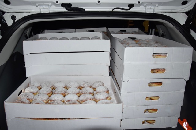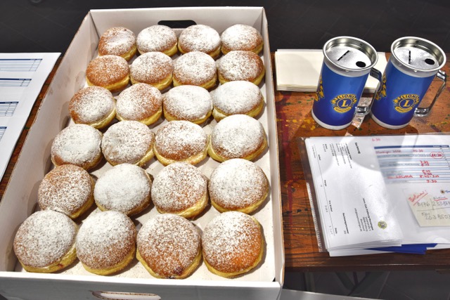 Bei regnerischem Wetter wurden am Schmutzige Dunschdig morgens ab 6:30 Uhr sage und schreibe 13.440 Berliner in die „Lions-Taxis“ verladen. Am späteren Vormittag hatten dann alle Unternehmen und Privatpersonen, die bei unserer Mailingaktion mit anhängendem Bestell-Shop die klassischen Berliner mit Marmeladenfüllung bestellt hatten, die topfrischen, fluffigen Leckereien auf dem Tisch.